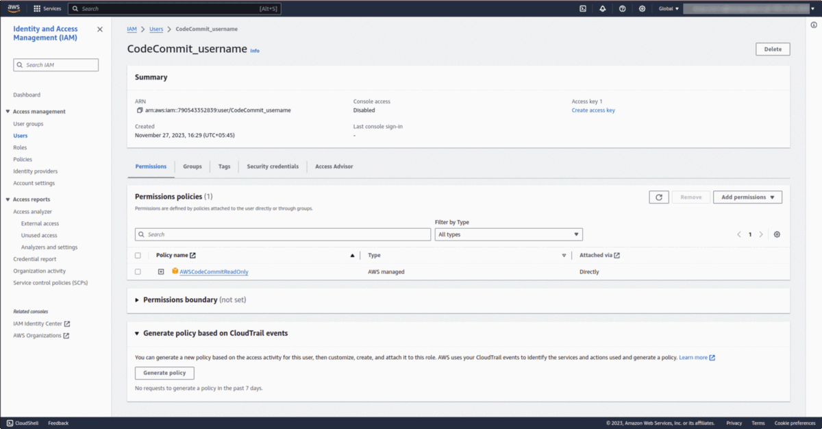 - Set Permissions: Choose "Attach Policies directly." In the permission policies search bar, type "codecommit" and select "awsCodeCommitReadOnly." Click 'Next.'